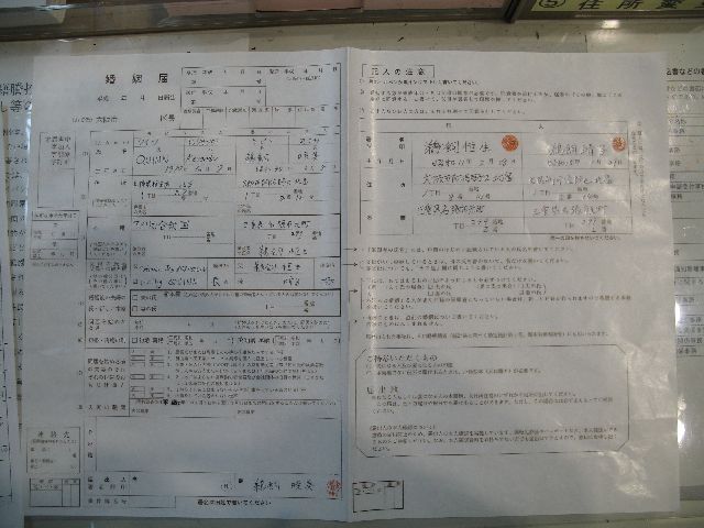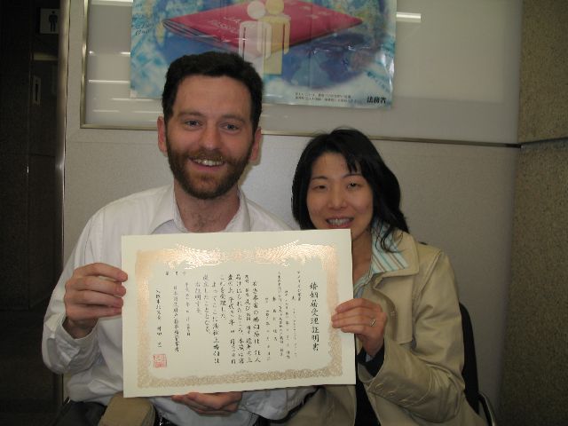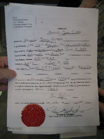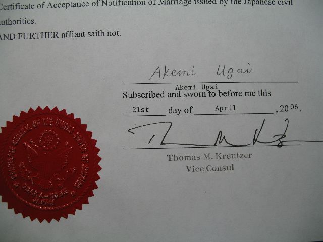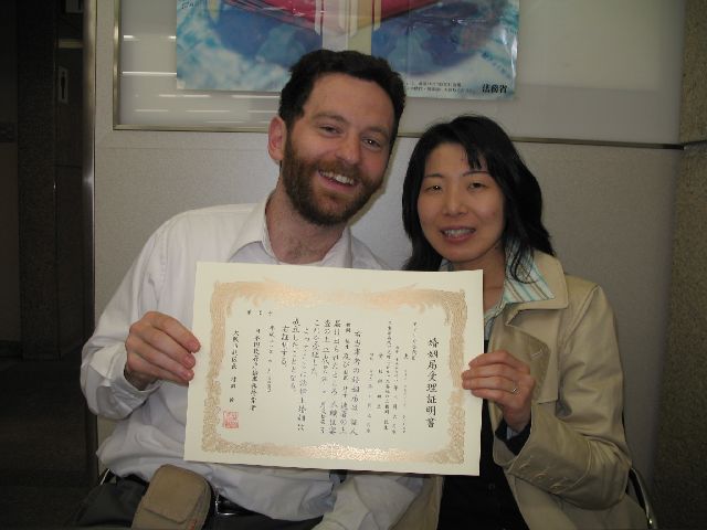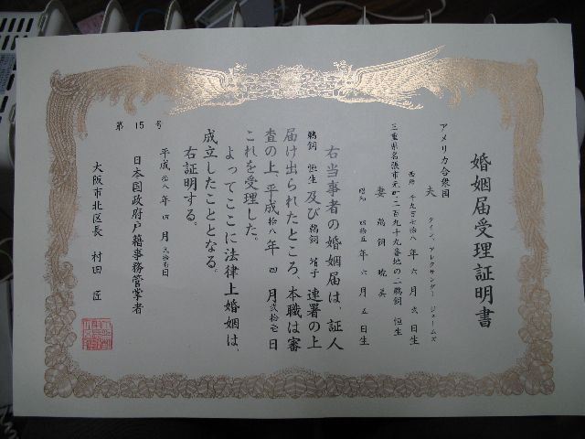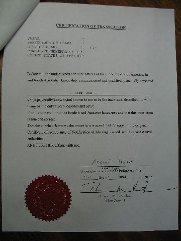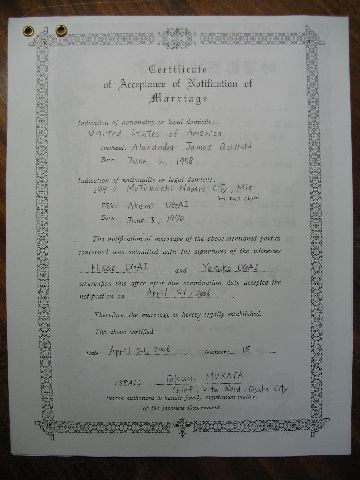 Well, we haven't made any plans about a ceremony yet, but today was the "big day" when we made things official. First, we went to the US Consulate in Osaka and got a form saying the United States gives me permission to get married in Japan. Then, we went to the local municipal office (kuyakusho) and filed the papers that make us legally married. We talked to the guy there, Kajiya-san, and even gave him my online contact info. He eventually gave us a big marriage certificate. Finally, we went back to the consulate, wrote a translation of the marriage certificate in English, and had them certify it. That will be our official record of our marriage in the United States.