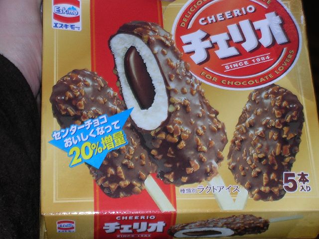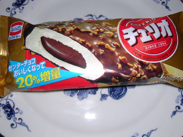 | Vanilla ice cream bar covered in milk chocolate and almonds, with a solid chocolate core. Called Cherio or something like that. |