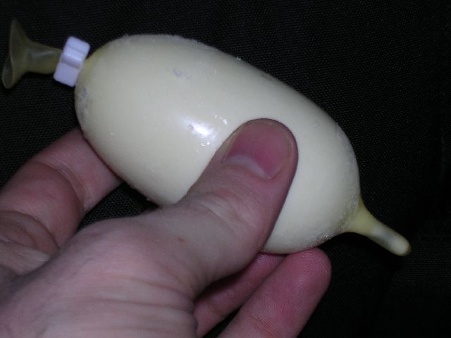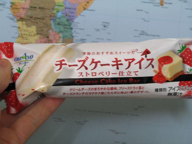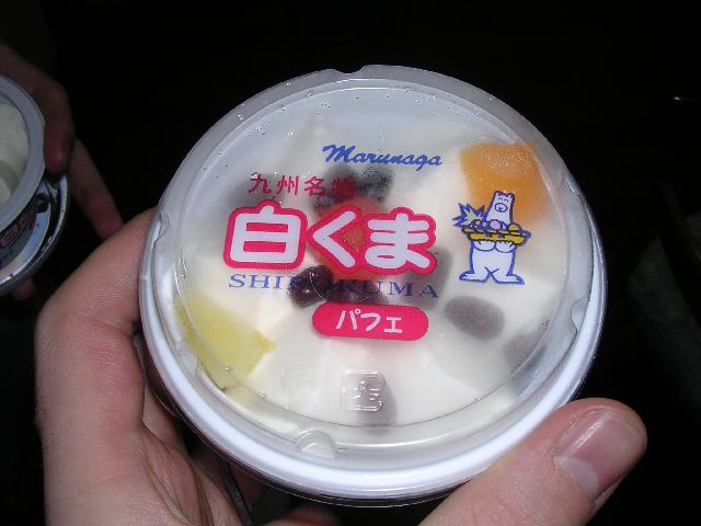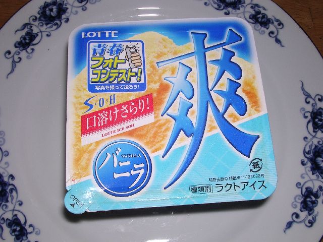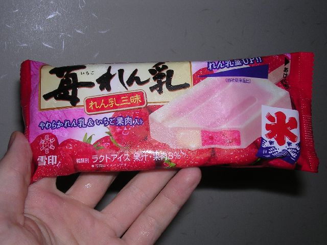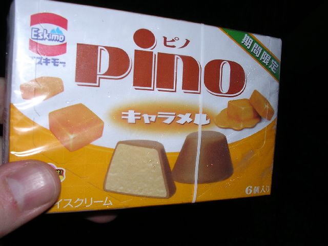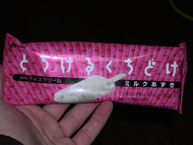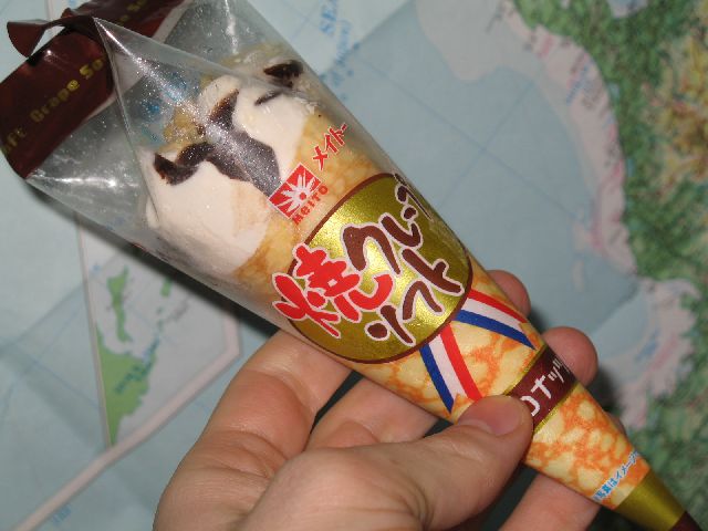 | Probably the weirdest ice cream I've had in Japan. It's just vanilla ice cream inside. But, you eat it out of a latex wrapper that looks very much like a condom. You cut off the end of the container and the ice cream starts flowing out. You eat it as it comes out. It's hard to stop it. If you like it, you can suck it out faster. Yeah. Totally gross. |