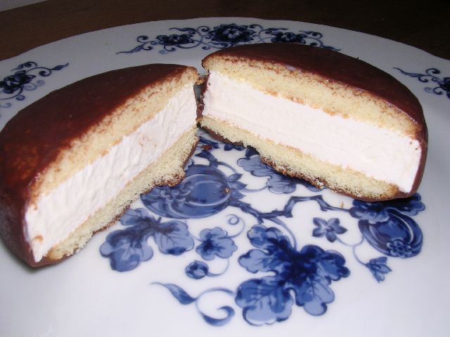 | Two cookie-biscuits with ice cream and whipped cream in between, all covered in milk chocolate |