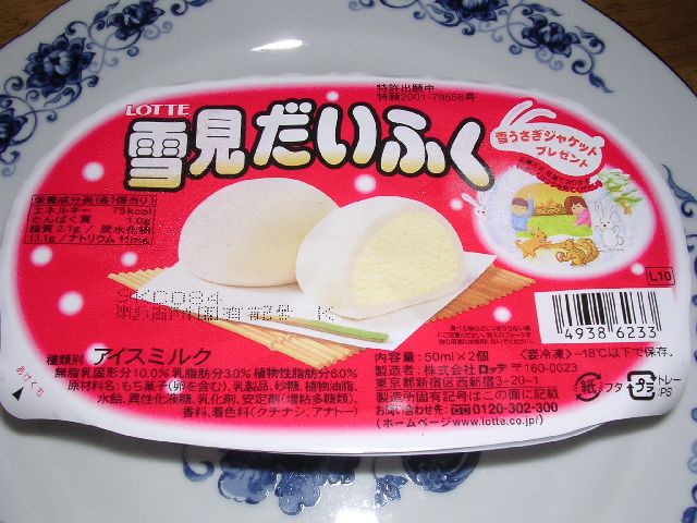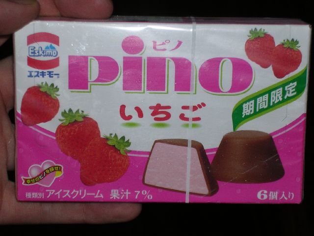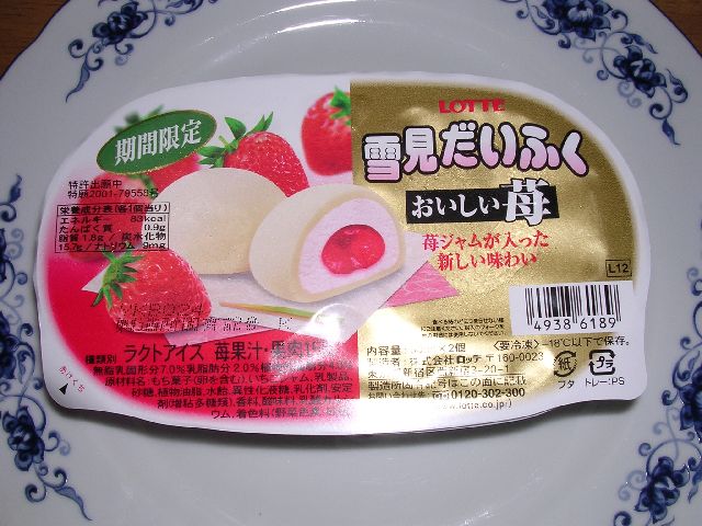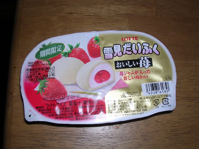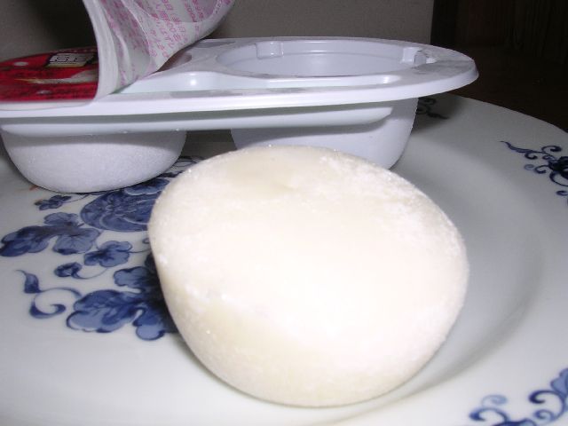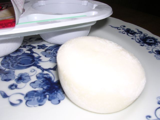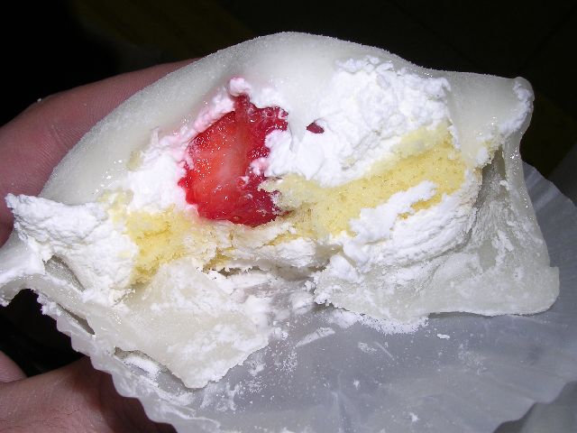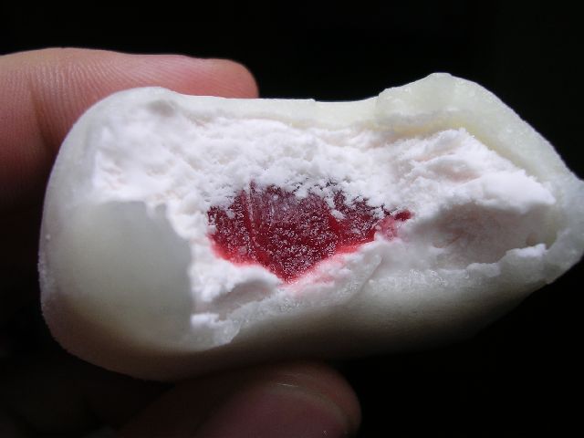 | Vanilla ice cream with strawberries in the middle, covered in rice flour dough (mochi) with a layer of powdered sugar between the ice cream and the dough. It sounds complicated, but it is quite good. This is a commercial take on a delicious dessert usually found at specialty shops. |