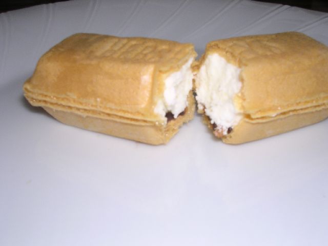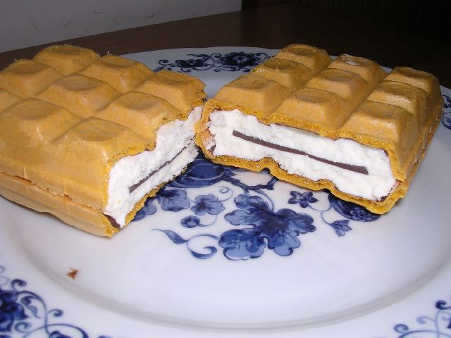 | Waffle filled with vanilla ice cream, with a solid bar of hard milk choclate running down the middle |