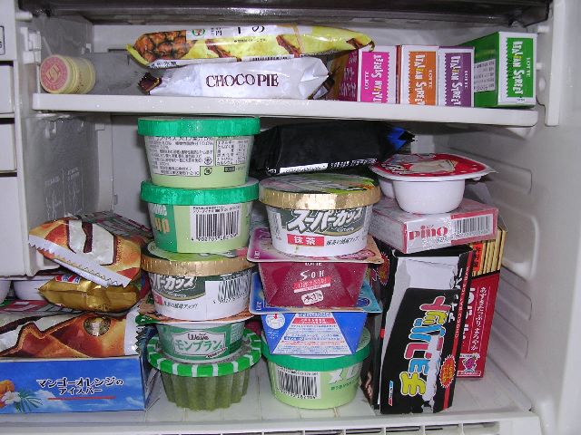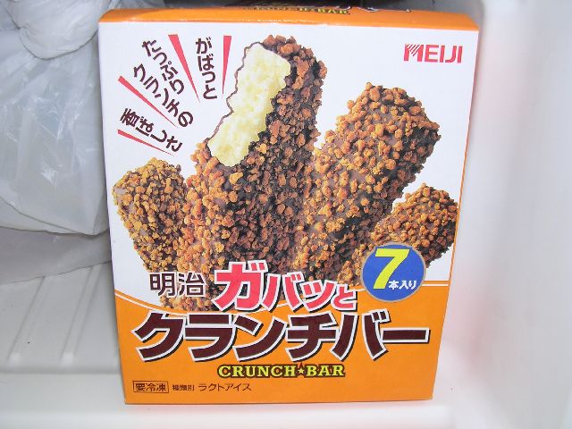 | The freezer case at a convenience store I visited on the island of Shikoku. You can see vanilla, strawberry, green tea, rich milk, orange, melon, royal milk tea, sweet red bean (azuki), cookies and cream, caramel crispy sandwiches, rich milk crispy sandwiches, and chocolate crispy sandwiches. |
