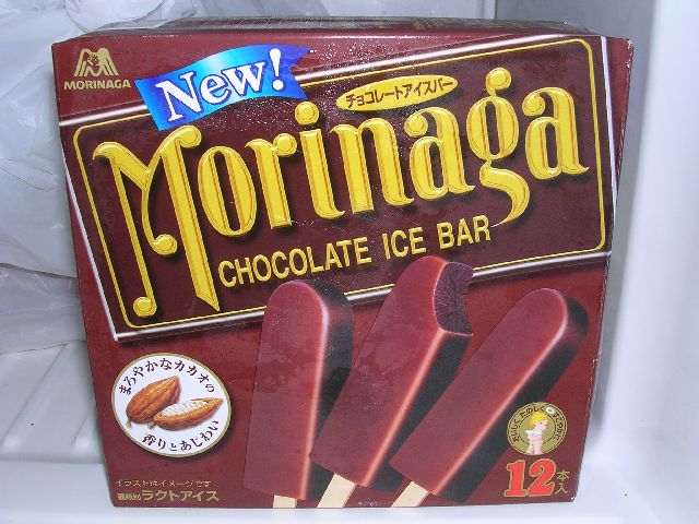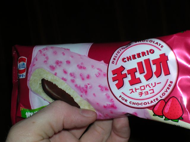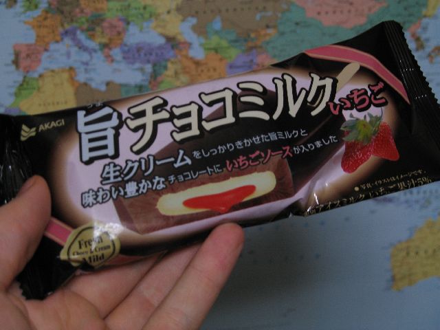 | Chocolate-milk-strawberry bar. The outside is like a fudge-sickle. Inside is a thick layer of condensed milk with a thin core of strawberry jam. |