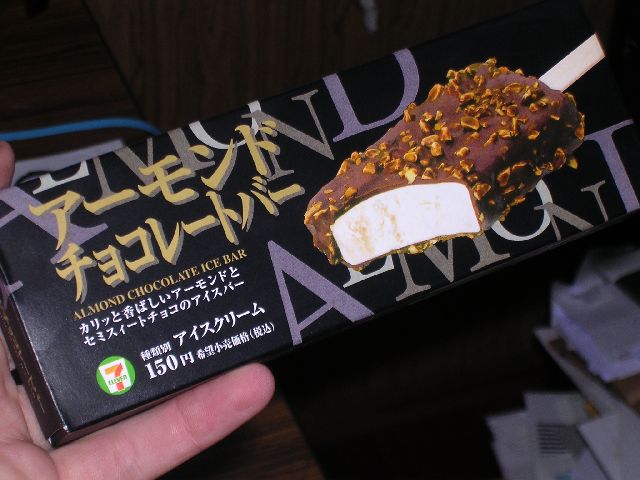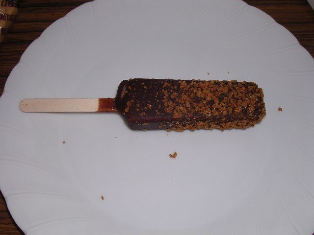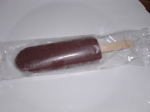 | Vanilla ice cream covered in chocolate and almonds. Better than average for these things. |