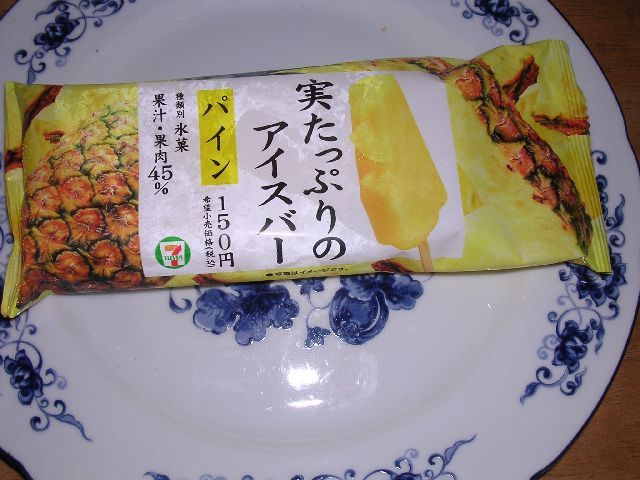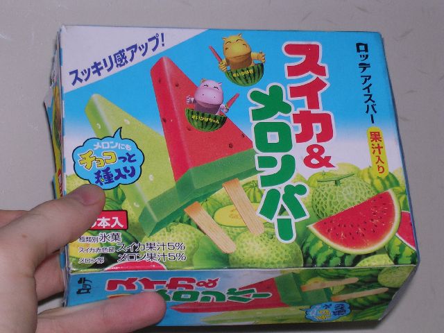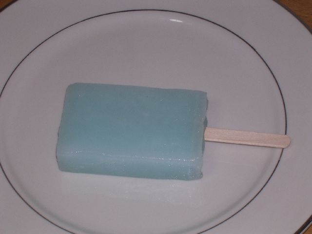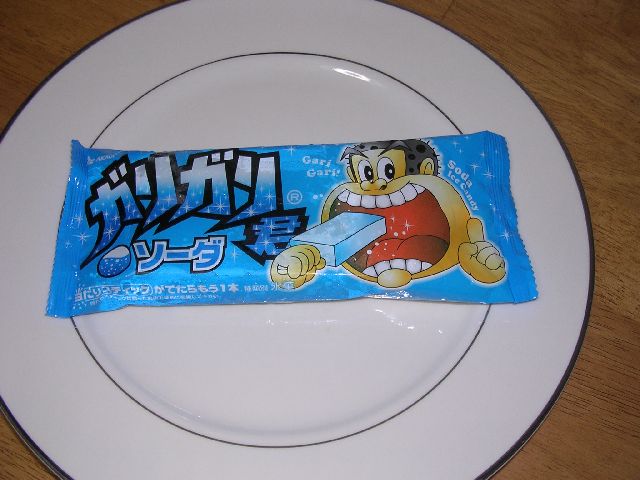 | Garigari popsicle. A guy in the Netherlands wrote to me and asked about some blue popsicles he sees in Japanese movies all the time. I'm almost sure these are the ones. I bought this and photographed it just for him. It's a boring but sweet soda flavored popsicle. |