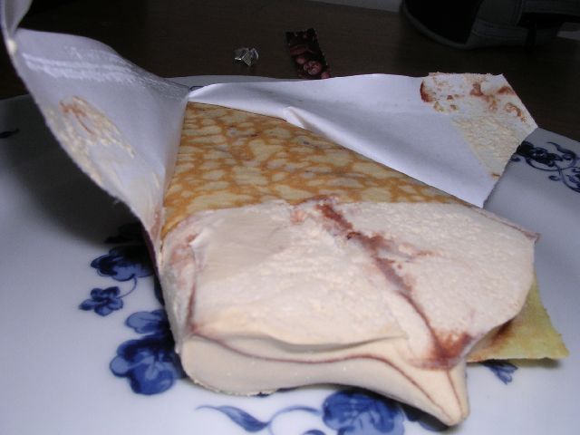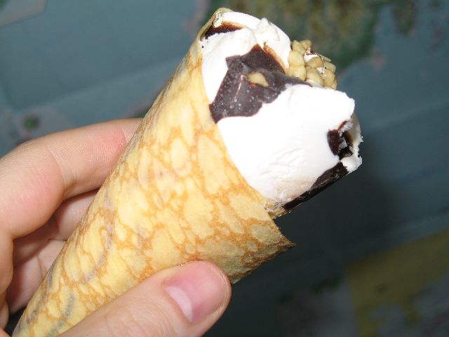 | Vanilla ice cream wrapped in a crepe. The crepe is good. The vanilla is average, but the whole thing is very good. |