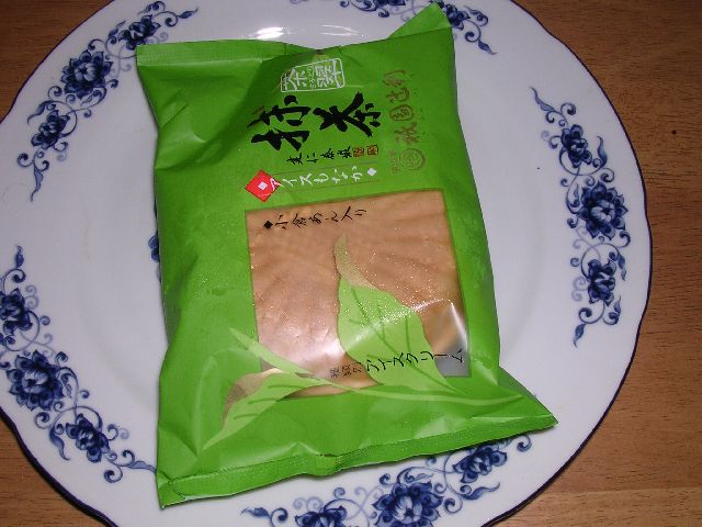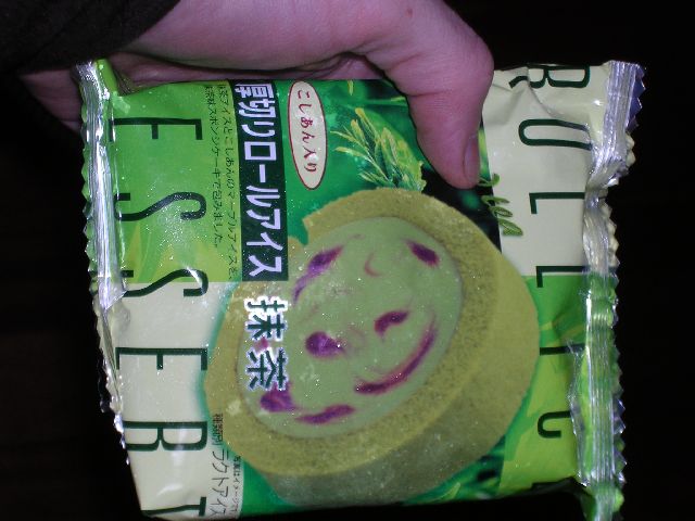 | Green tea (matcha) ice cream sandwich. This one was rather expensive. ¥315 (≈$3.15) I wouldn't have bought it, but a guy at the 7-11 who I talk to a lot told me they're really good and sell fairly well. Actually, it was awfully good, but maybe not 3 times as good as the other ones which cost about ¥100 (≈$1.00). |