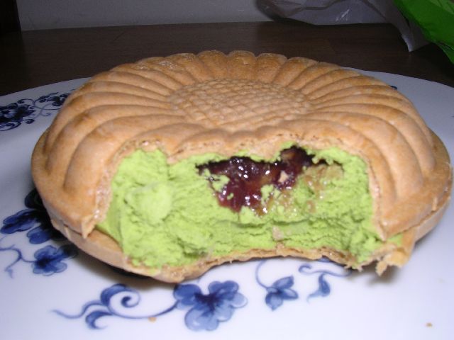 | Green tea (matcha) ice cream sandwich, consumption in progress. |
