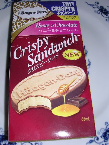 | Haagen Dazs - honey and chocolate ice cream sandwich, sandwich is a crispy wafer, sides are covered in chocolate, but the wafer is not. |