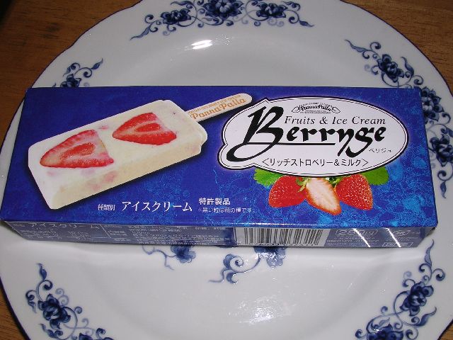 | Vanilla ice cream bar with half strawberries embedded, very tasty like everything else here. |