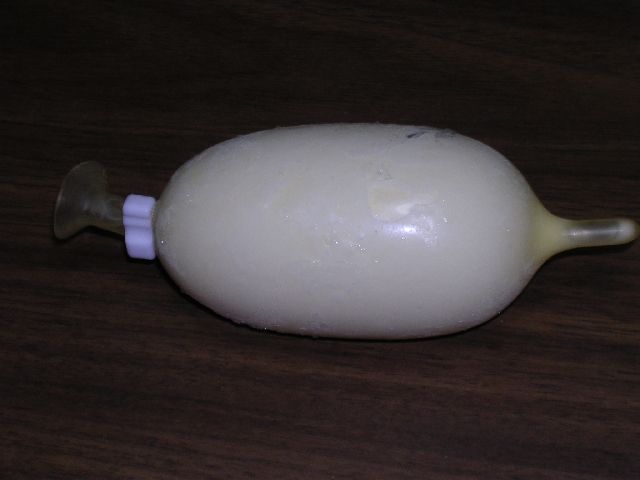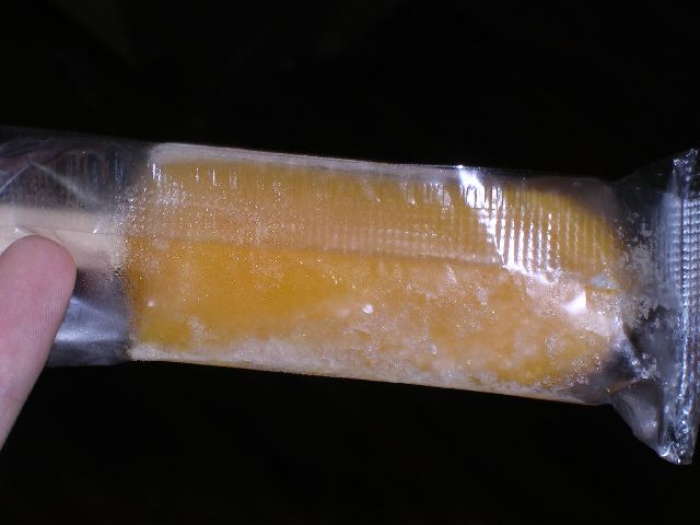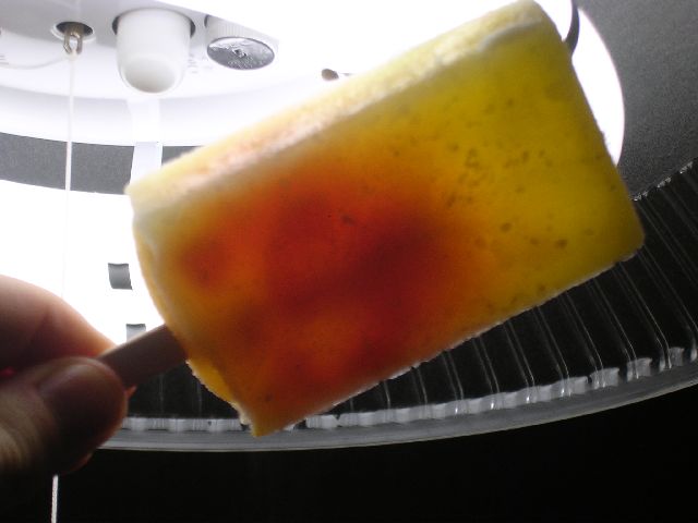| Mikan popsicle ready for action. I held it up to the window so you could see the chunks of orange inside. |