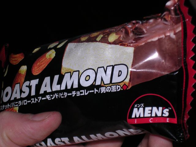 | Just what it looks like. Vanilla ice cream bar covered in chocolate and roasted almonds. |