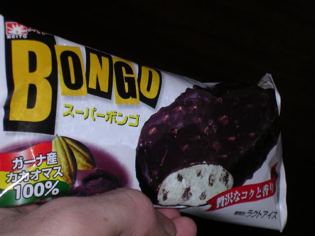 | Bongo vanilla ice cream bar covered in chocolate with nuts. There's a layer of cookie inside and little bits of chocolate cookie mixed into the ice cream. |