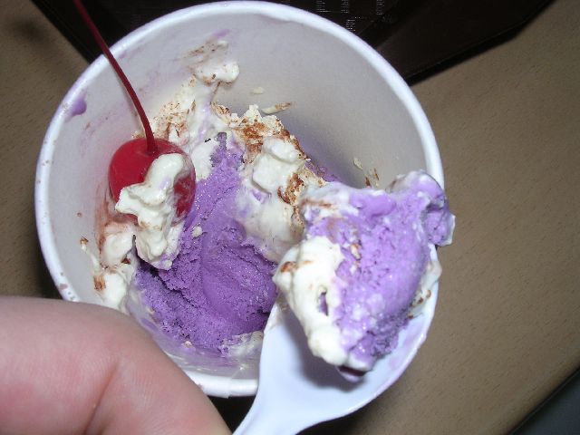 | Malaysia - yam ice cream with whipped cream and cherry on top. |