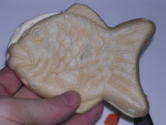 | This is very Japanese, I think. It's a fish shaped pastry-type-thing filled with red bean ice cream. |