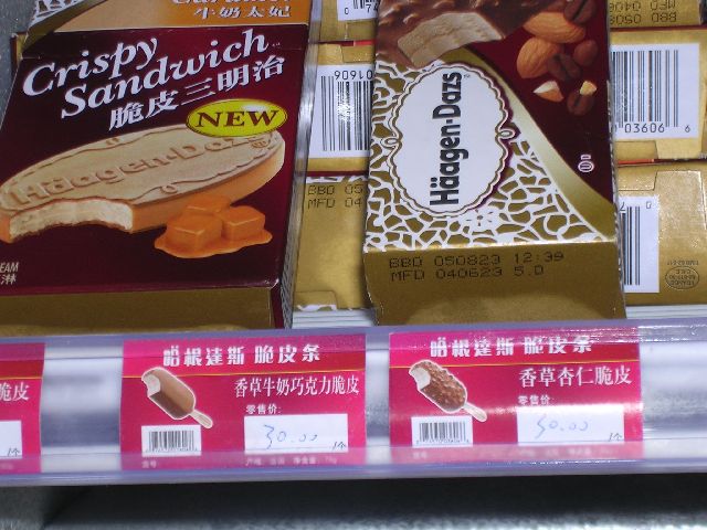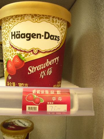 | China - plain old strawberry ice cream being sold at a convenience store. It's interesting to note the price, about $9 or $10 in US funds. Even more expensive than Japan, and much more expensive than the same thing in the United States. It's odd for a poor country like China. |