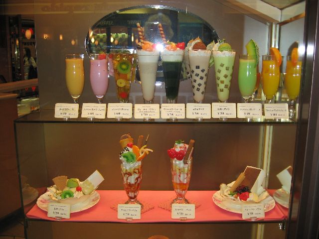 | A display of various desserts offered at a diner in the Namba neighborhood of Osaka. |