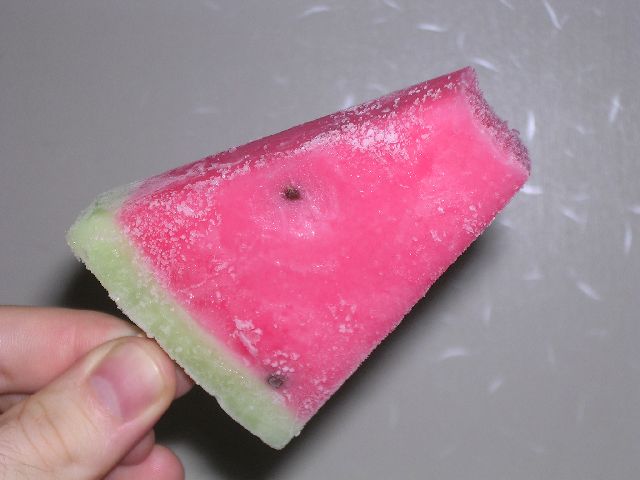 | This watermelon popsicle has little chunks of slightly crunchy chocolate in place of watermelon seeds. |