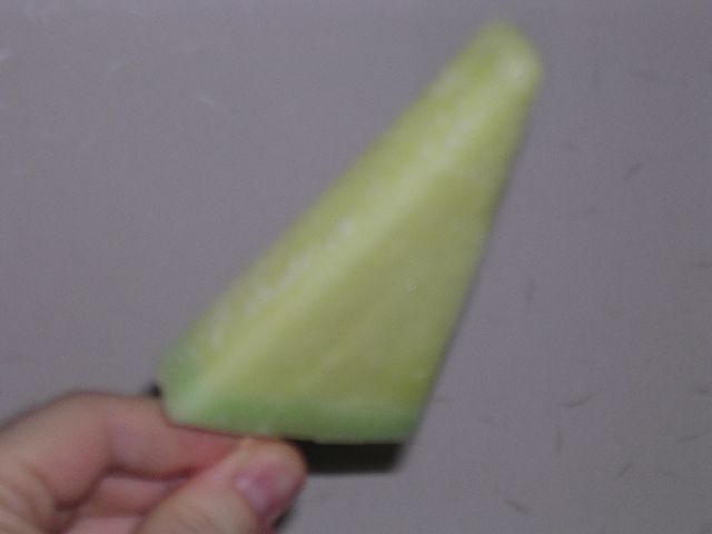 | This honeydew melon popsicle has chunks of slighly crunchy white chocolate in place of seeds. |