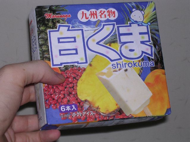 | These Shirokuma (White Bear) ice cream bars have fruit and beans mixed in. |