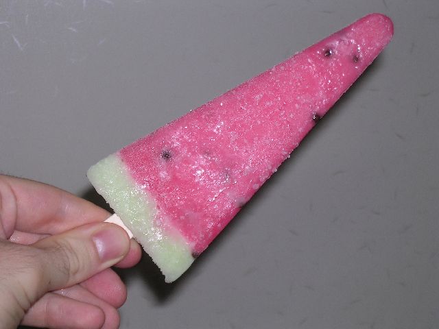 | Jumbo watermelon popsicle with semi-hard chocolates for seeds. |