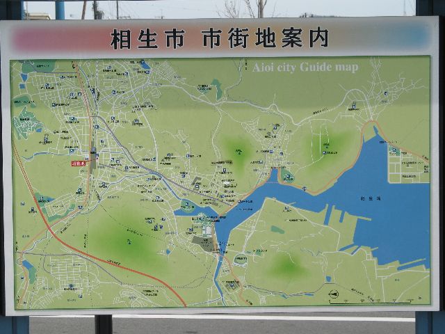 | A map of Aioi posted on a sign in front of the station. It's not very legible, even if you can read Japanese, but it gives you an idea of the shape of the place and the harbor that cuts into the middle of the city. |
