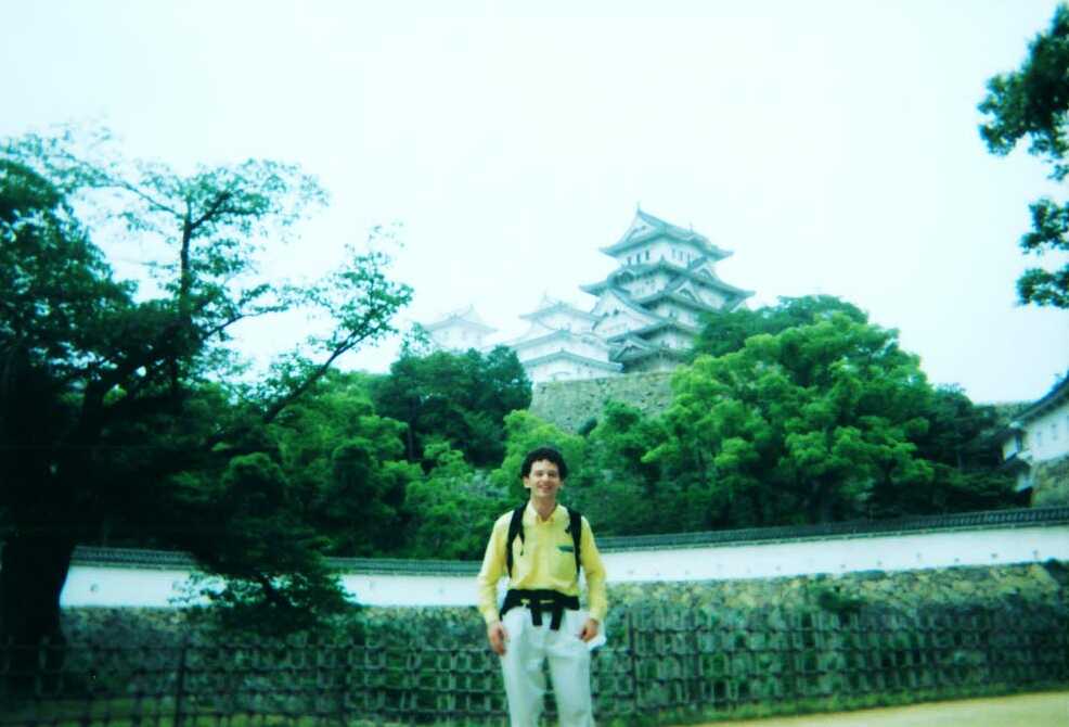 After the zoo, I went on to Himeji's main attraction, the great Himeji-jo. Himeji-jo is recognized by UNESCO (United Nations Educational, Scientific and Cultural Organization) as a world cultural heritage site. So, it's definitely something to see. It dates back as early as 1346. It is said to have a very intelligent design from a military perspective. It is in excellent condition now. Here's a picture of me outside the castle. Himeji castle with Alex